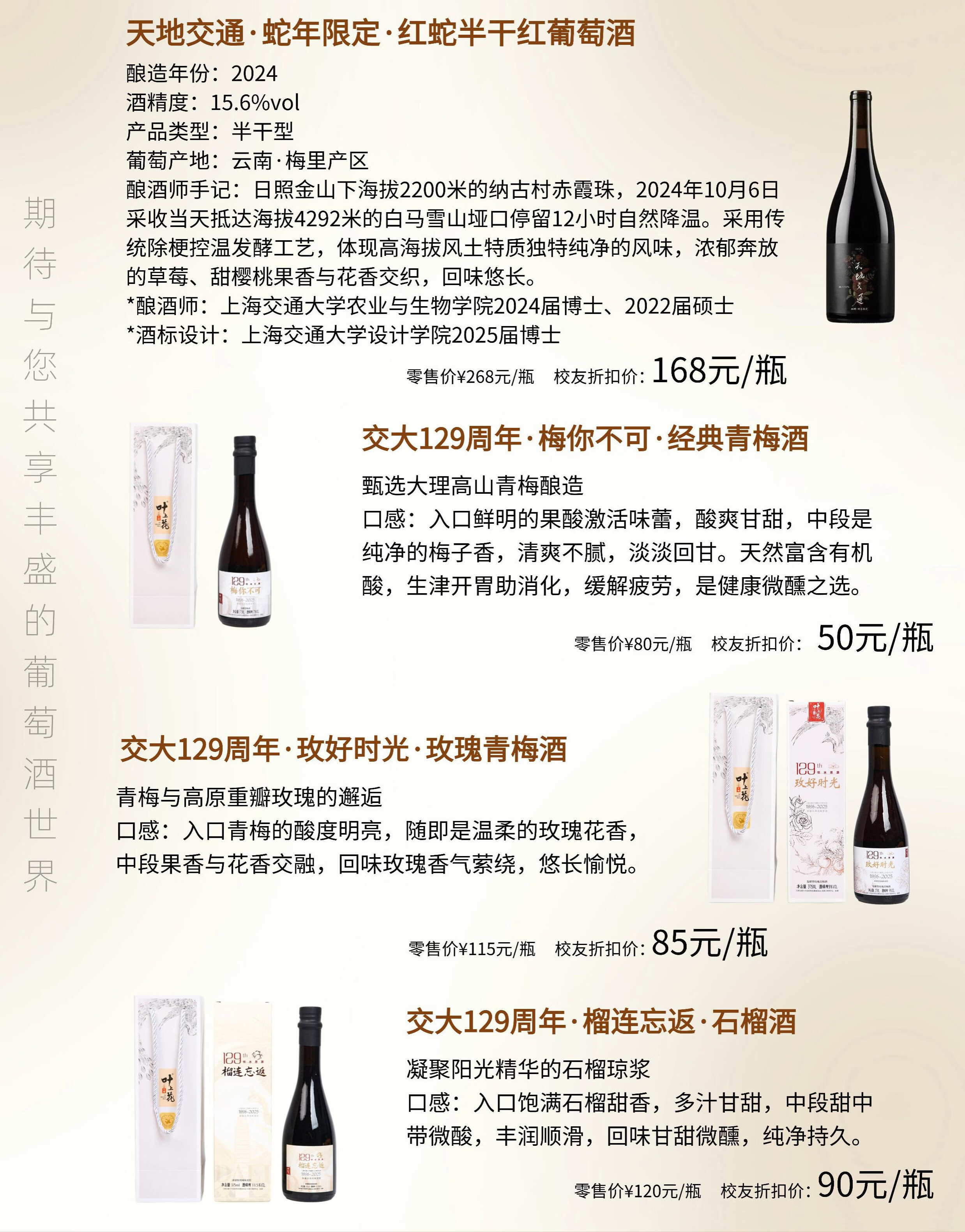天地交通系列葡萄酒特邀上海交通大学宋士任老师(西班牙里奥哈大学葡萄栽培与酿酒学)为酿酒顾问,采用上海交通大学培育酿酒葡萄优系及先进酿造技术匠心研制,与王朝御马酒庄、云南香格里拉、山西戎子酒庄教学研究基地深度合作。